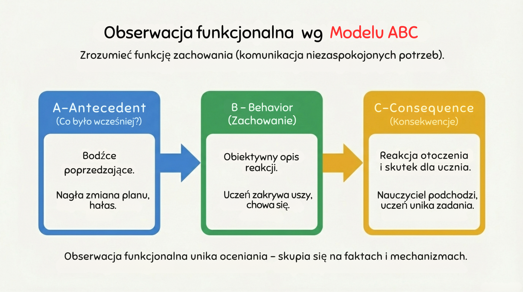 Wyniki szkolnej oceny funkcjonalnej powinny znajdować bezpośrednie odzwierciedlenie w praktyce dydaktycznej. Istotnym elementem tego procesu jest obserwacja funkcjonalna, rozumiana jako pogłębiona i celowa analiza zachowania ucznia w kontekście sytuacji, w których ono występuje. W przeciwieństwie do tradycyjnej obserwacji pedagogicznej, koncentrującej się głównie na opisie zachowań, obserwacja funkcjonalna zakłada próbę zrozumienia ich znaczenia i funkcji. Analizie podlega nie tylko samo zachowanie ucznia, lecz także to, co je poprzedza oraz jakie przynosi konsekwencje, zgodnie z modelem ABC (Antecedent–Behavior–Consequence):