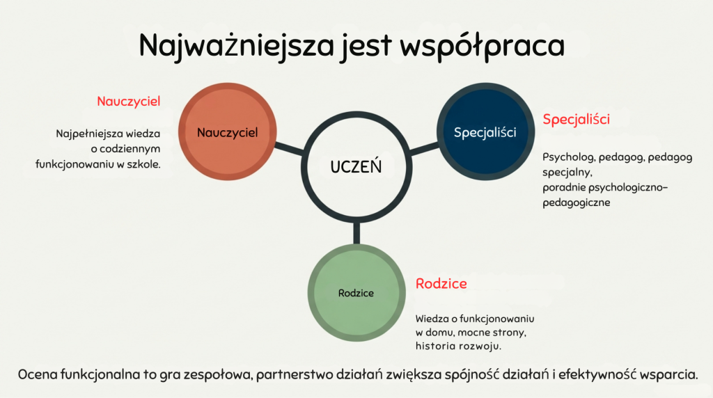 Nieodłącznym elementem oceny funkcjonalnej jest współpraca z rodziną ucznia oraz z różnymi specjalistami zaangażowanymi w proces wspierania jego rozwoju. Ocena ta ma charakter zespołowy i międzysektorowy – uczestniczą w niej nauczyciele, pedagodzy, psychologowie, pedagodzy specjalni, specjaliści z poradni psychologiczno-pedagogicznych, a w razie potrzeby także przedstawiciele ochrony zdrowia.