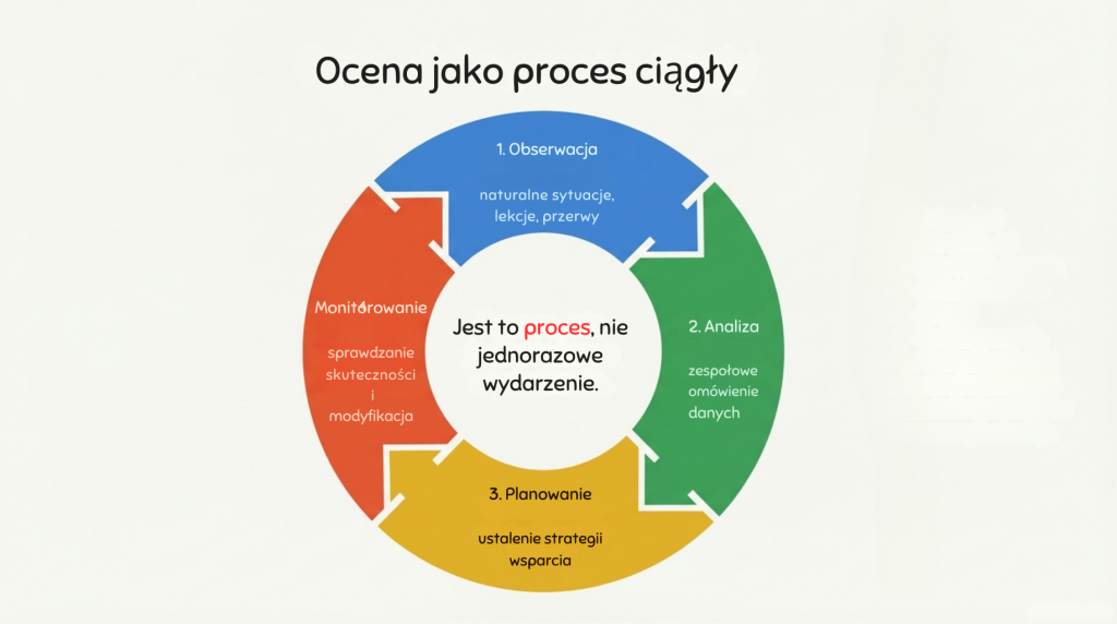 Ocena funkcjonalna w praktyce szkolnej ma charakter procesu, a nie jednorazowego działania. Opiera się na systematycznej obserwacji ucznia w naturalnych sytuacjach edukacyjnych – podczas lekcji, pracy indywidualnej i zespołowej, przerw międzylekcyjnych oraz aktywności pozalekcyjnych. Szczególnie istotne jest analizowanie tego, w jaki sposób uczeń radzi sobie z wykonywaniem zadań, komunikuje się z rówieśnikami i nauczycielami, uczestniczy w życiu klasy oraz jakie strategie stosuje w sytuacjach trudnych. Informacje te stanowią cenne źródło wiedzy dla nauczycieli i specjalistów, ponieważ umożliwiają lepsze rozpoznanie rzeczywistych potrzeb ucznia. Proces szkolnej oceny