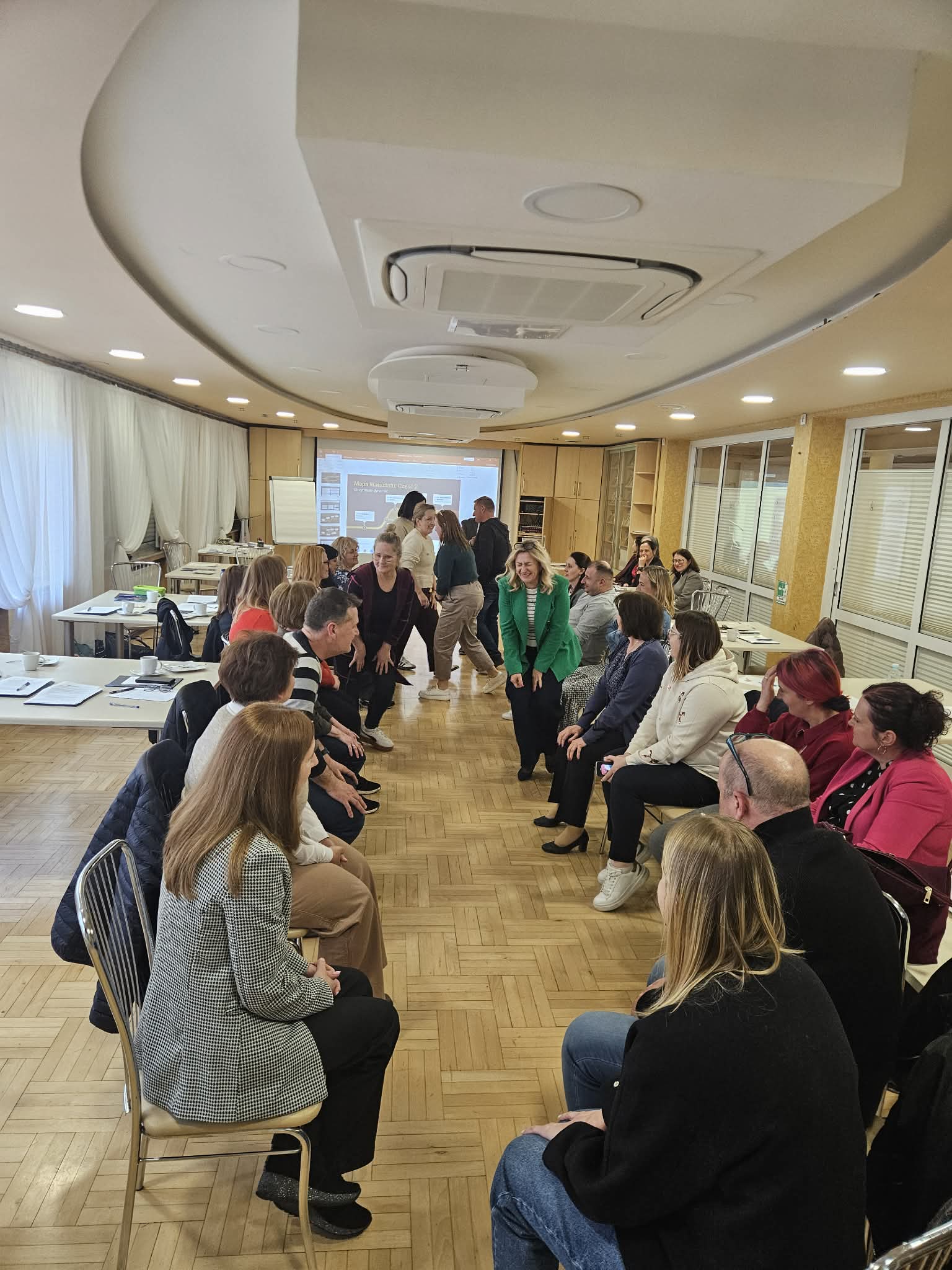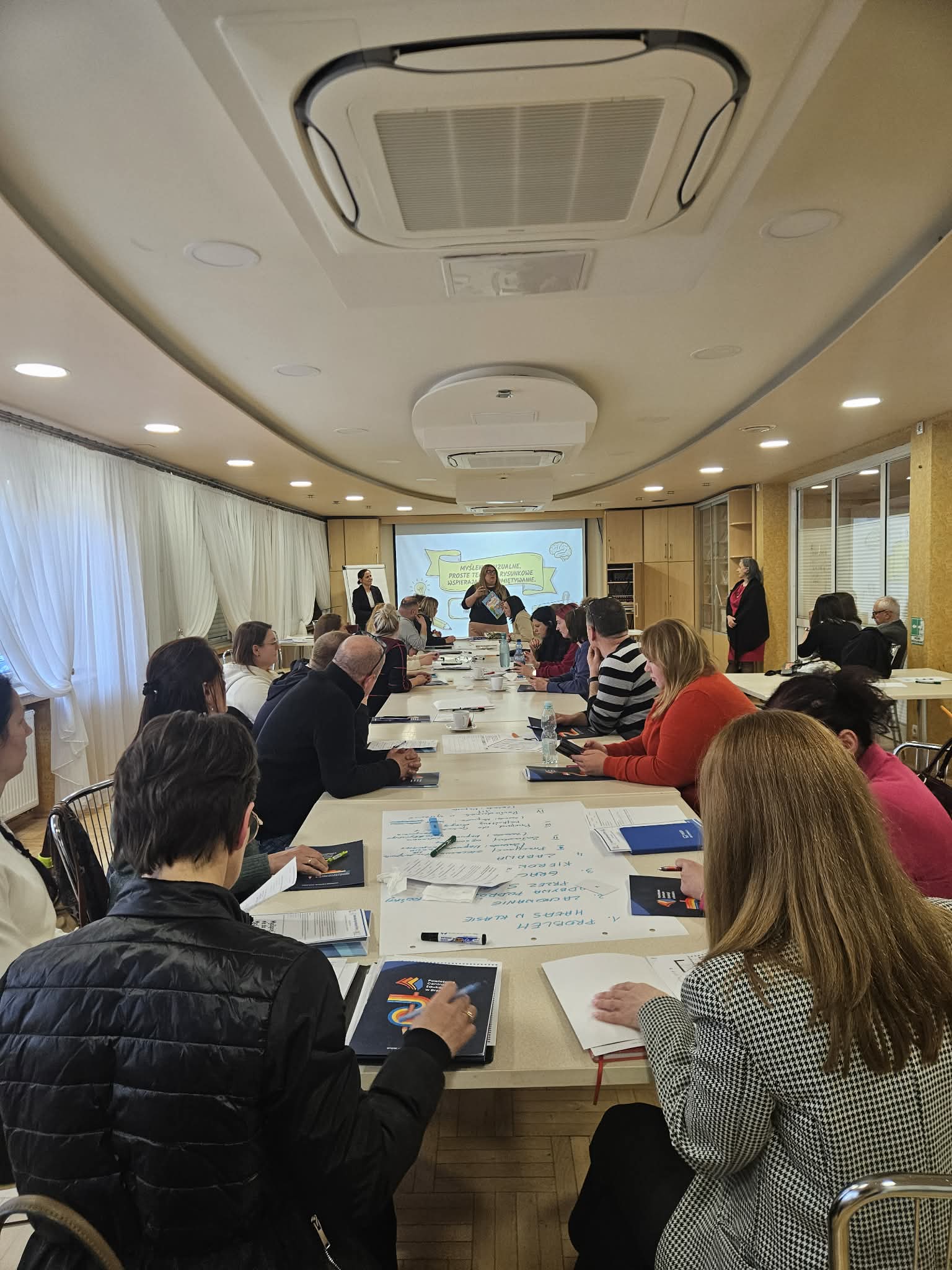 Całość spotkania była rytmizowana sekcjami energizerów, prowadzonych przez Jarosława Wytrwała, doradcę ds. techniki. Te krótkie formy aktywności fizycznej to nie tylko sposób na integrację nowych zespołów czy urozmaicenie godzin wychowawczych, ale przede wszystkim konieczność fizjologiczna. Zgodnie z zasadą dynamiki pracy umysłowej, na każde 30 minut intensywnego wysiłku kognitywnego powinno przypadać 10 minut ruchu (gimnastyka śródlekcyjna). Ruch zwiększa przepływ krwi przez mózg, dotlenia neurony i pozwala na „przewietrzenie” struktur poznawczych, co jest niezbędne dla utrzymania wysokiej efektywności uczenia się przez cały dzień.